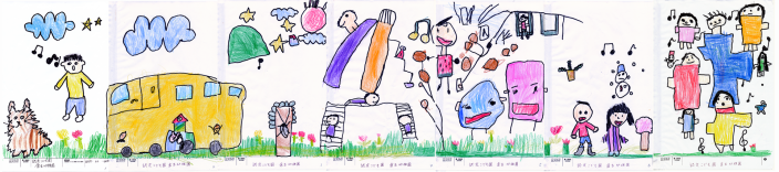 年長児、風ぐみの子どもたち21名全員で描きました。大きなピアノを中心に道が伸び、そのまわりでは、たくさんの子どもたちが笑顔いっぱいで音楽を奏でています。そして、いつもお散歩で訪れる身近な風景もたくさん登場し、子どもたちの「大好き」がぎゅっと詰まったとってもかわいらしい作品になりました。音楽と日々の思い出が広がるあたたかく素敵な一枚です。ピアノが届いたら、ピアノを囲んでみんなの大好きな歌をたくさん歌いたいです。