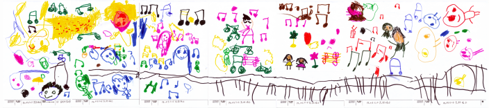 年長さんが発表会で歌った歌を口ずさみながら幼児クラスみんなで描きました!1人が音符を描くとまわりの子も「わたしもかけた!せんせいみて!」とつながっていく様子が音楽のすばらしさを教えてくれました。ピアノがきたら先生だけがひくのではなく子どもたちも楽しめるようにしたいです。